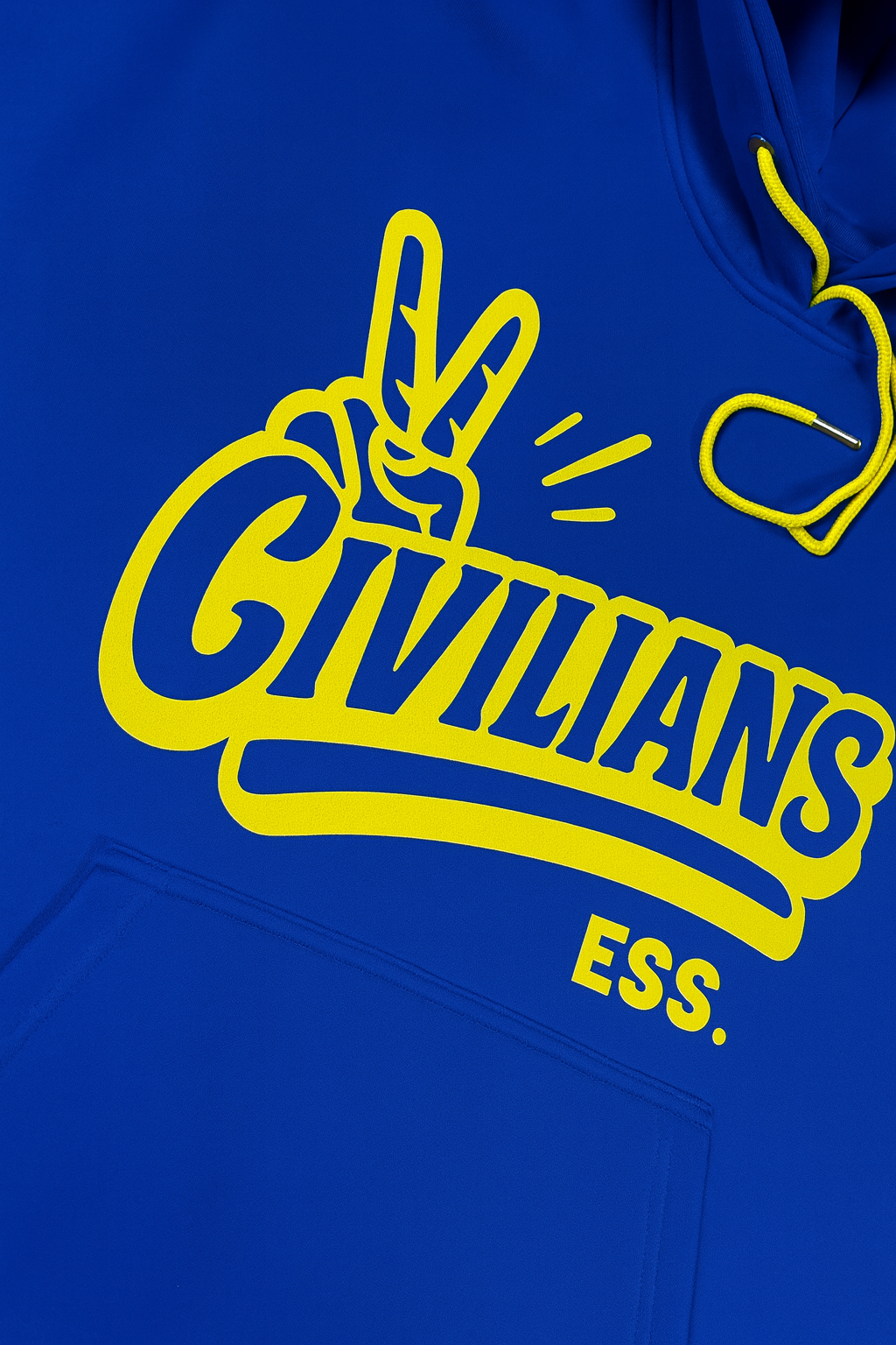 - Front Design: The golden-yellow Civilians logo and peace-sign hand radiate power, optimism, and victory. Yellow speaks to hope and vitality, creating a vibrant contrast against the deep blue foundation.