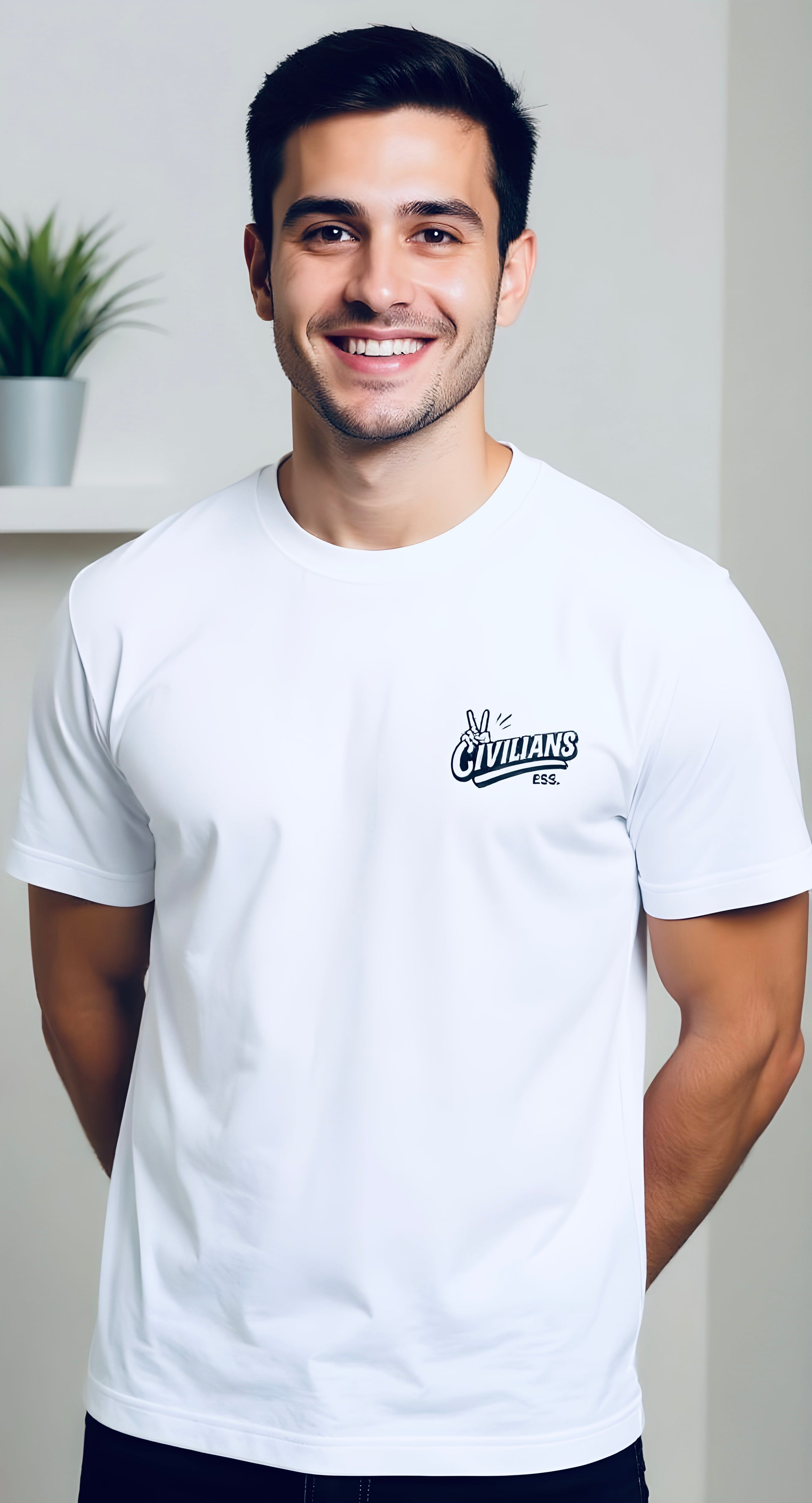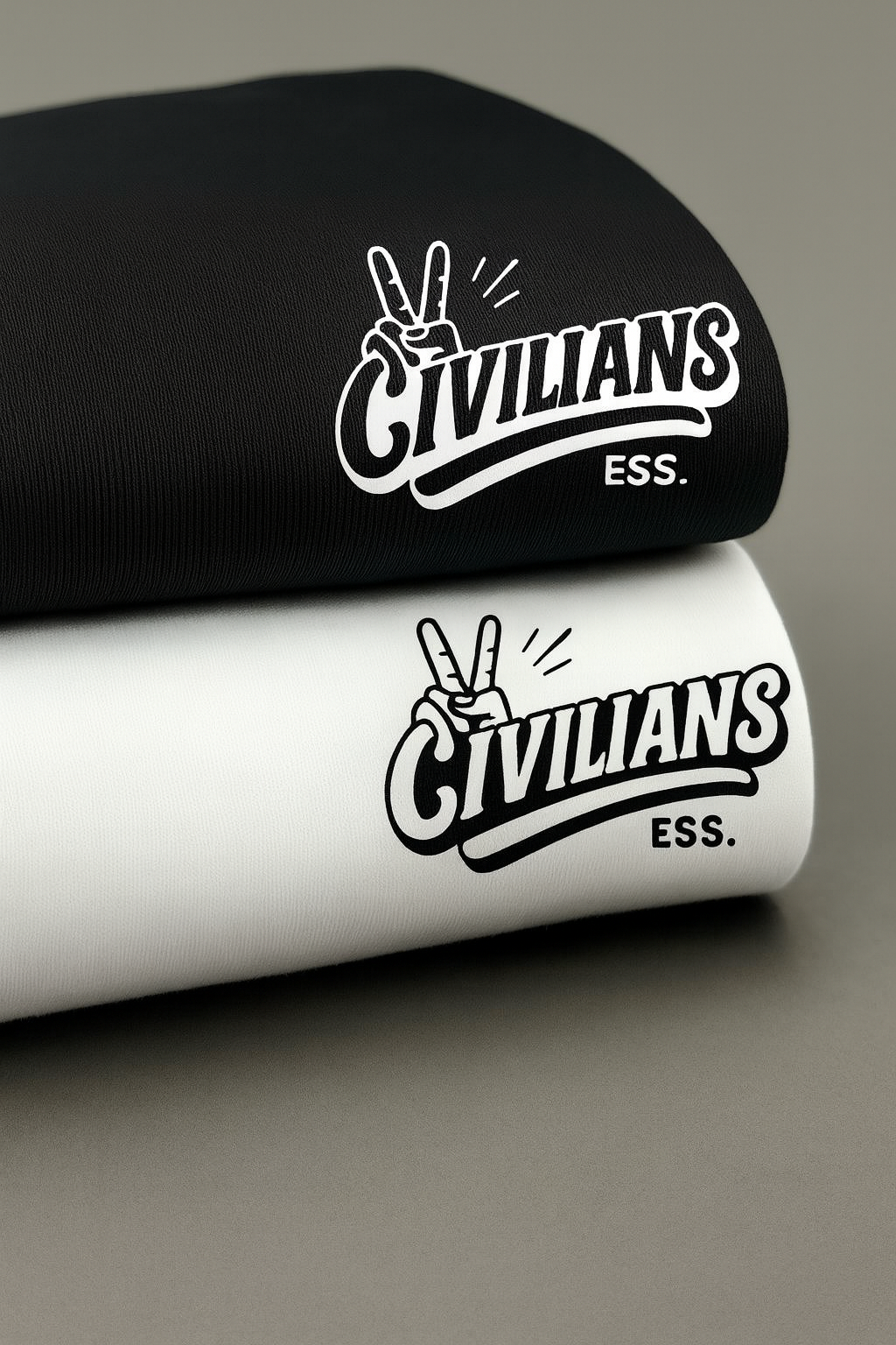 Front: Clean And minimal with the Civilians ESS logo + peace sign hand graphic.